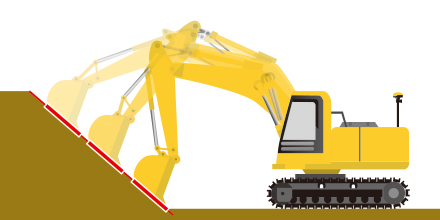 アームレバーを操作するだけで、バケットの刃先の高さが設計面と合うようにブームの角度を自動制御します。
