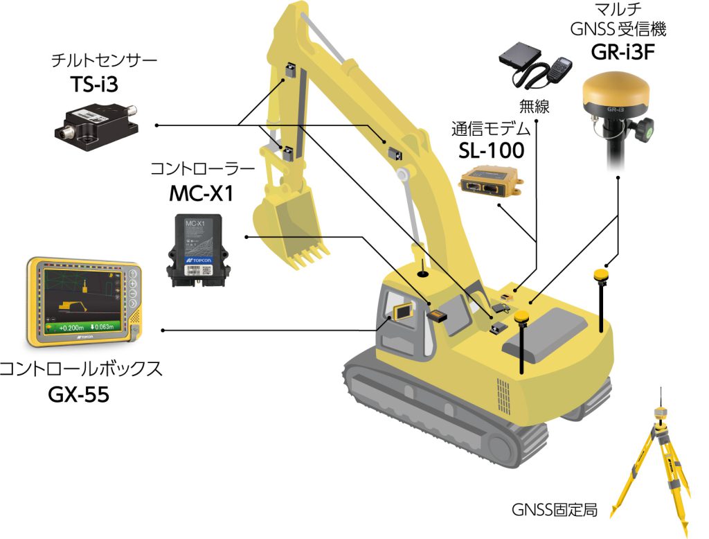 杭ナビショベルは小規模向けのマシンガイダンスシステムですが、より大きな規模へ対応したGNSSタイプのマシンガイダンスおよびマシンコントロールへのシステムアップグレードが可能です。