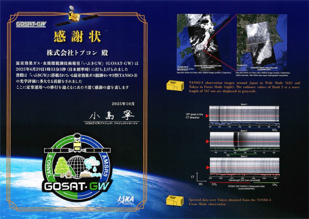 トプコンは、気候変動の解明と持続可能な社会の実現に貢献するため、温室効果ガス・水循環観測衛星「いぶきGW」(GOSAT-GW)に関する取り組みに協力しています。